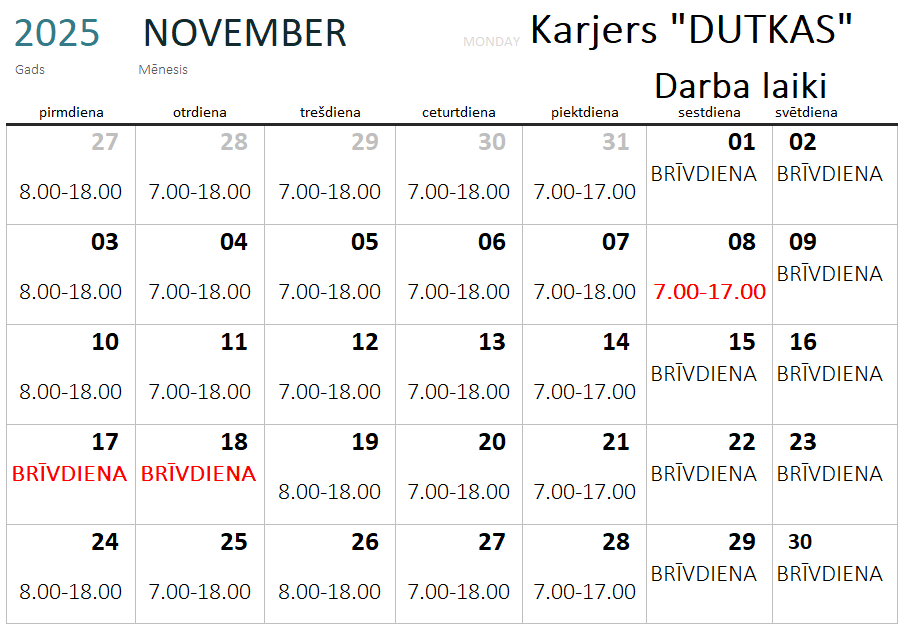 Iespējamas svētku un sezonālas izmaiņas darba grafikā.
